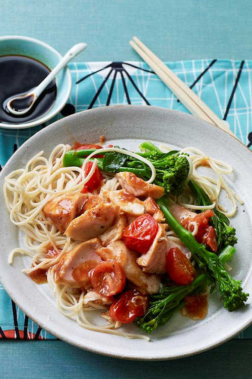 Divide the noodles and broccoli between four warmed plates. Top with the salmon fillets and scatter with the cherry tomatoes. Season with pepper and serve sprinkled with a little soy sauce, if using.