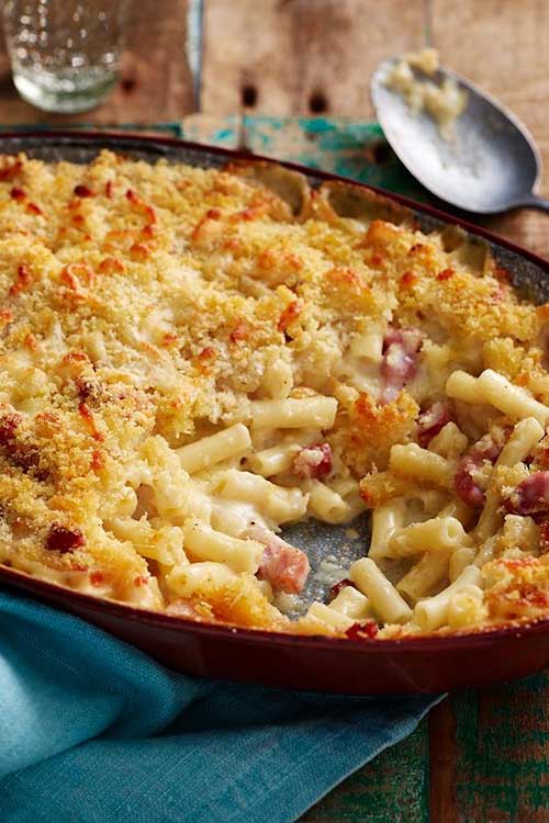 Fry the bacon in a frying pan until crisp. Stir into the macaroni cheese and pour the mixture into the ovenproof dish.