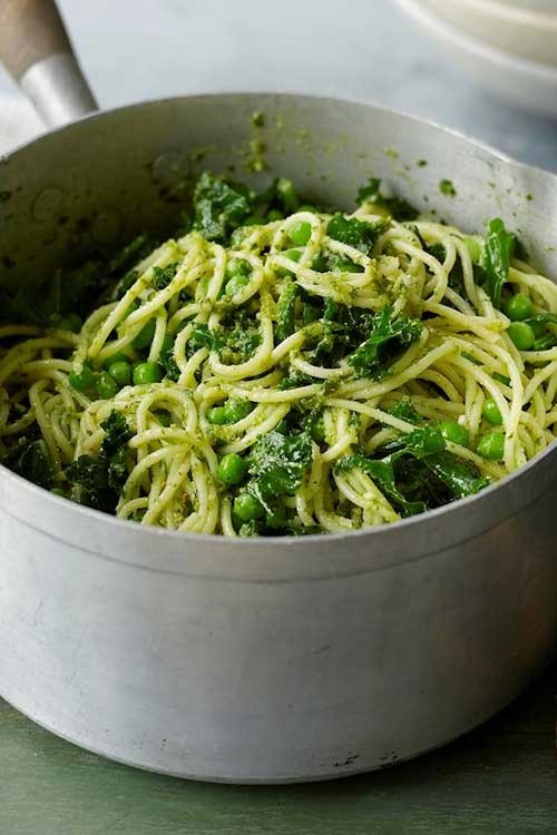 Cook the spaghetti according to the packet instructions. Add the kale and peas for the last 1–2 minutes of the cooking time.