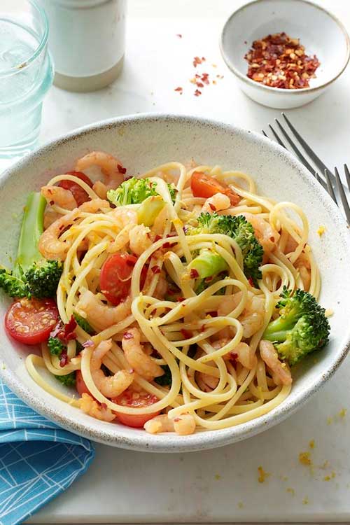 This healthy prawn pasta recipe is given a bit of a spicy kick with the addition of chilli flakes. It is also a low-calorie meal.