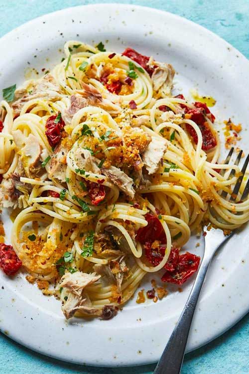 Cheap and abundant in healthy fats, tinned mackerel is a great way to make your midweek pasta super-nutritious as well as convenient. These easy lemon chilli breadcrumbs are perfect to make with leftover bread and are delicious sprinkled over all types of pasta as a vegan alternative to Parmesan.