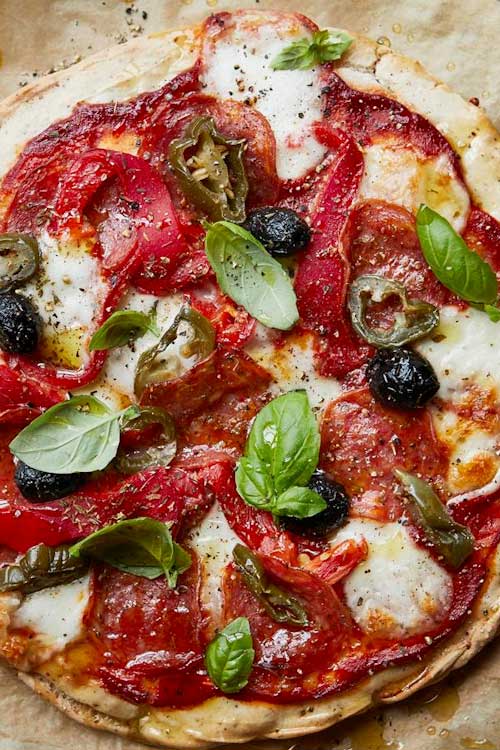Spread the tomato mixture over the pizza bases, leaving a 1cm border all around. Scatter over the mozzarella, olives and jalapeños and arrange the pepperoni and strips of roasted red pepper on top. Season with black pepper and a pinch of dried oregano and cook each for 10 minutes, or until the cheese is bubbling and starting to brown.