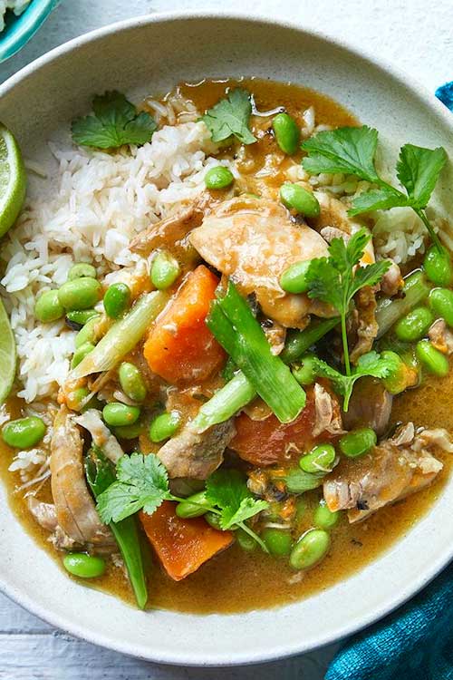 Bulking out a curry with vegetables is a great way to stretch a small amount of meat to keep the cost down. But, if preferred, simply swap the sweet potatoes and edamame beans for two extra chicken thighs.