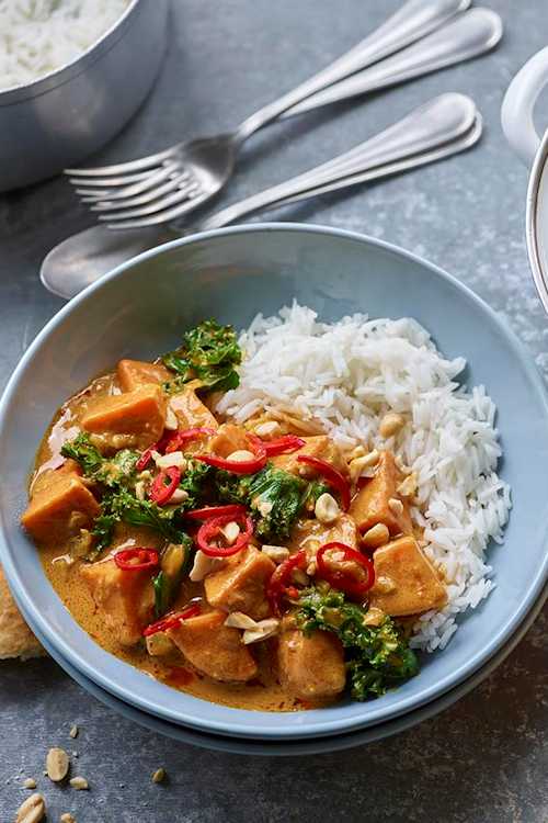 Stir in the kale and cook for 1 minute. Taste and season with lime juice, salt and pepper. Ladle the curry over rice or into bowls for dunking the bread in. Garnish with the roasted peanuts, if using, and chilli, if you like it spicy.