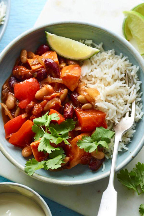 Get this vegan chilli going in the slow cooker and you’ll come back to a comforting dish to enjoy with rice, avocado, dairy-free yoghurt, coriander and lime wedges. A cheap, comforting dinner.