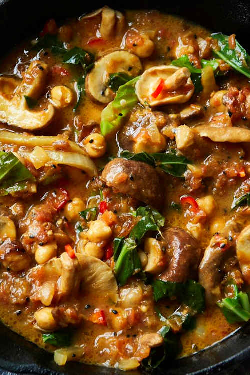 Bhaji means ‘fried vegetables’ in Hindi – it doesn’t have to be a crispy onion snack – and this mushroom bhaji is a quick, easy and colourful vegan curry dish. Serve with freshly cooked basmati rice or flatbreads and lime wedges.