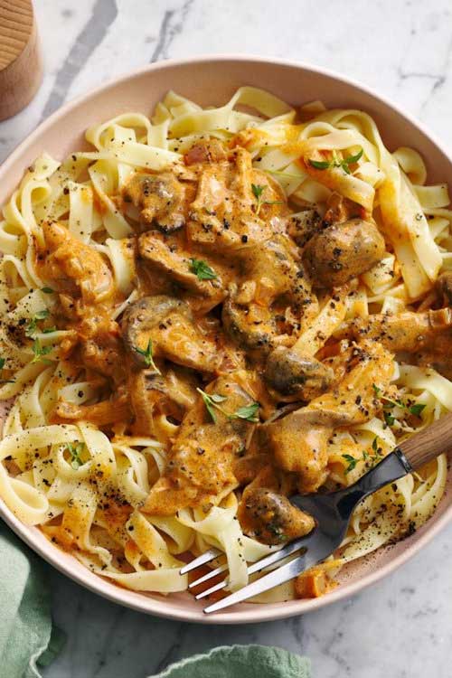 This vegan mushroom stroganoff is served with a flat ribbon pasta, such as pappardelle or fettuccine. It’s rich and full of flavour and quick to cook – ideal for a midweek supper.
