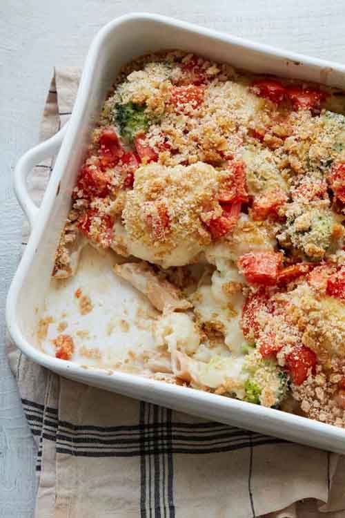 Tip the pasta, broccoli and cauliflower into a shallow, ovenproof dish. Pour the sauce over, top with the chopped tomatoes and sprinkle with the breadcrumbs and nutritional yeast. Drizzle over the olive oil and bake for 25 minutes, or until the sauce is bubbling and the top is lightly browned.