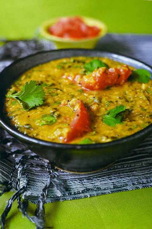 Yellow split lentils (moong dal) are used in this hearty lentil curry, but you could always substitute them with red split lentils if liked.