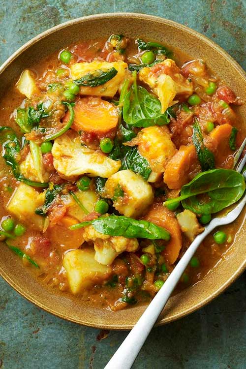 You can add any vegetables you have into this curry, just make sure they're chopped small enough to cook in the same time as the potatoes.