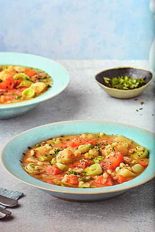 Stir in the stock pot, celery and leek, cover again and cook for a further 2-3 hours or until the vegetables, pearl barley and lentils are tender. Check the seasoning, scatter over the parsley and serve hot.