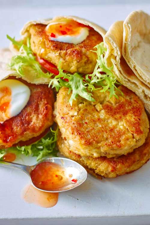 These burgers are delicious cold, so they make brilliant packed lunches. Mini versions of the burgers also work well as canapés, topped with a dab of chilli jam and garnished with sprigs of fresh coriander.