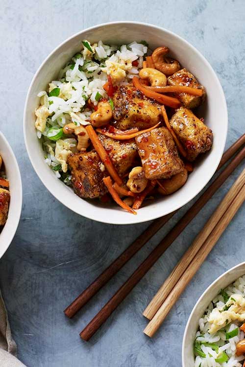 To serve, spoon the egg-fried rice onto four serving plates and top with a spoonful of chilli-fried tofu.
