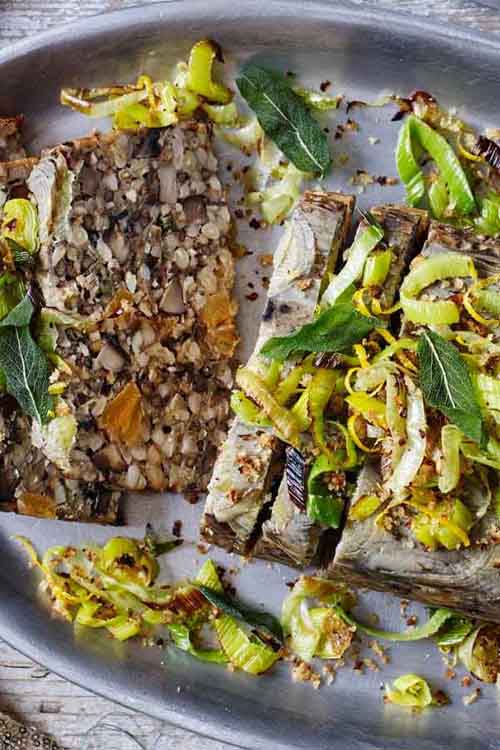 Put a layer of sliced leeks in the bottom of the prepared loaf tin so they are lying flat and evenly spread out (reserve the green parts for garnish). Pour the nut roast mixture on top and pack down with the back of a spoon. Cover with foil and bake for 1 hour. Allow the nut roast to rest for at least ten minutes before turning out.