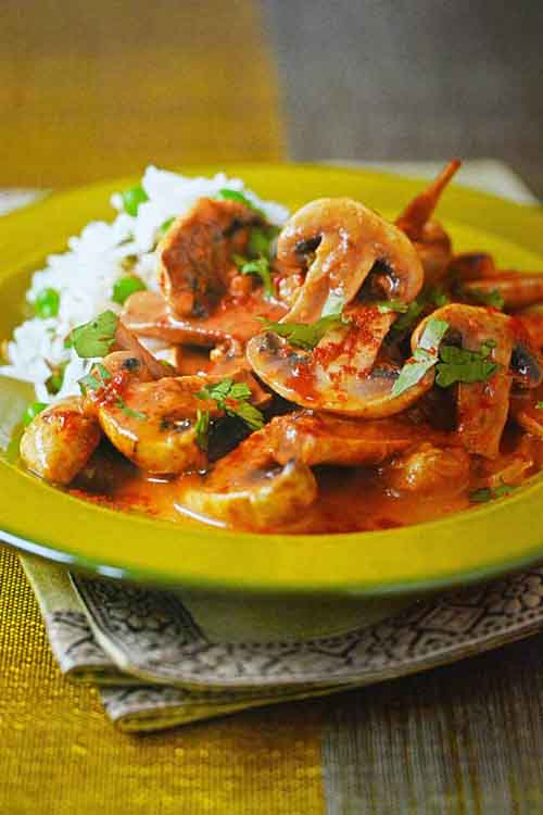 Place over a high heat and add the onion mixture. Stir-fry for 3-4 minutes and the add the yogurt, 1 tablespoon at a time. Add the tomato purée and ground coriander and stir-fry for 1 minute before adding 300ml of water, the mushrooms with juices and the chilli powder.