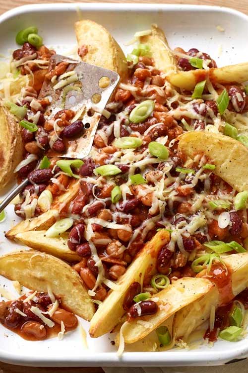 You can add extra beans, or frozen or tinned sweetcorn, to the chilli beans if you like. Or top the potato wedges with leftover chilli con carne.