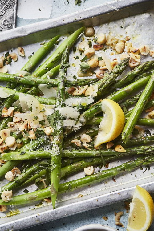 Make the most of tender, in-season asparagus spears by pairing them with garlic, thyme, hazelnuts and Parmesan.