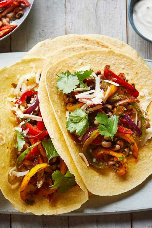 To assemble the fajitas, warm the tortillas according to packet instructions and place on serving plates or a board. Spoon some of the vegetable and bean filling onto each tortilla, top with the soured cream and cheese and roll up. Serve with the salsa and garnish with extra coriander.