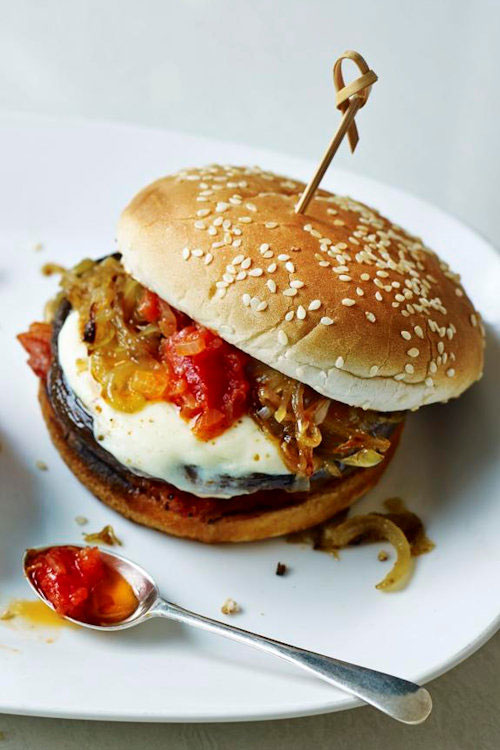 An irresistible vegetarian mushroom burger filled with melty mozzarella and slathered in homemade tomato relish.