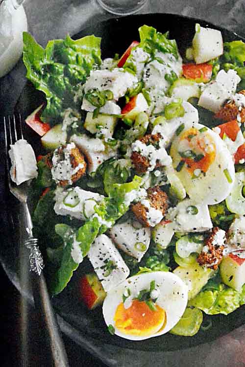 Place the chicken, apples, celery, spring onions, lettuce, egg halves and chives in a wide salad bowl. Drizzle the dressing over the salad ingredients and toss to mix well. Top with the garlic croutons.