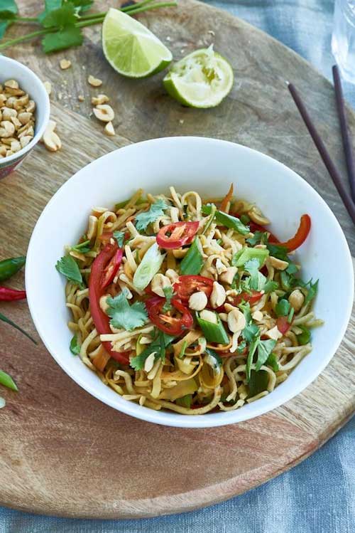 Stir in the drained noodles and heat through. Top with the crushed peanuts, chopped coriander and chilli. Serve.