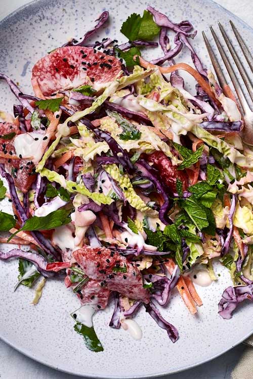 This red cabbage salad is a colourful variation on a classic coleslaw. It includes zingy flavours of grapefruit, ginger, fresh mint and coriander.