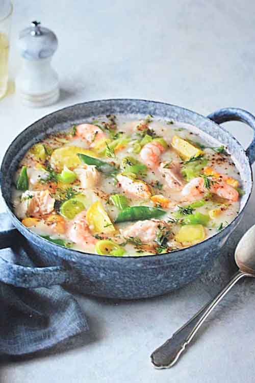 A chunky, creamy chowder with white fish, smoked haddock, prawns and potatoes - a hearty meal