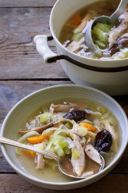 This warming Scottish cock-a-leekie soup is made in the traditional way, with shredded prunes to add slight sweetness and comfort.
