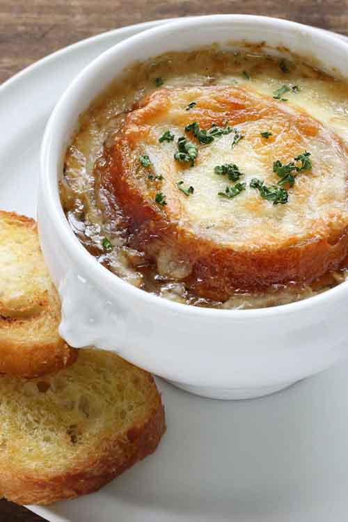 If cooking for vegetarians, the beef stock in this French onion soup could be substituted for mushroom stock.