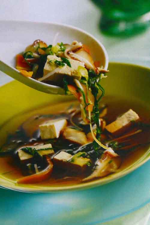 When you are almost ready to serve, bring the stock back to the boil, add the vegetables and tofu and season to taste with soy sauce and pepper. Reduce the heat and simmer for 2 minutes, then serve.