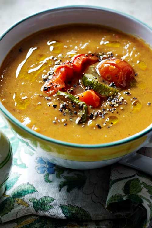 This healthy roasted vegetable soup can be made super quickly if you use a bag of frozen roast veg from a supermarket.