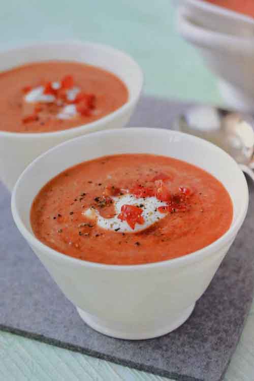 Ladle the soup into warmed bowls and serve immeadiately, garnishing with a little fromage frais and chopped tomatoes.