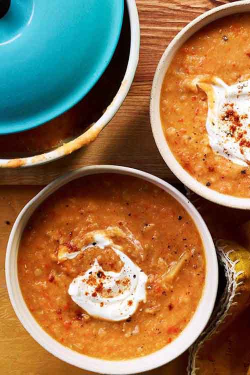 At this stage, you can either serve the soup chunky, or use a stick blender to blend until smooth (or somewhere in between the two).