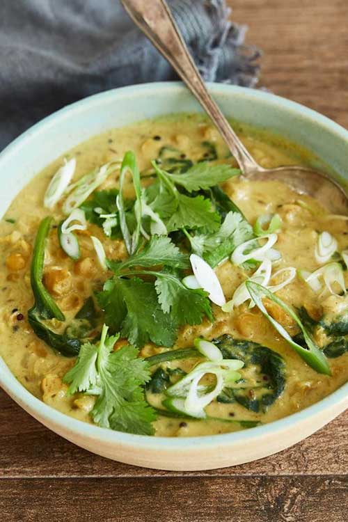 Add the coconut milk and simmer until the soup thickens slightly, or until it reaches your desired consistency. Taste and season with salt, if needed. Stir in the greens and cook until they wilt (if using frozen spinach, cook until it thaws). Serve immediately.